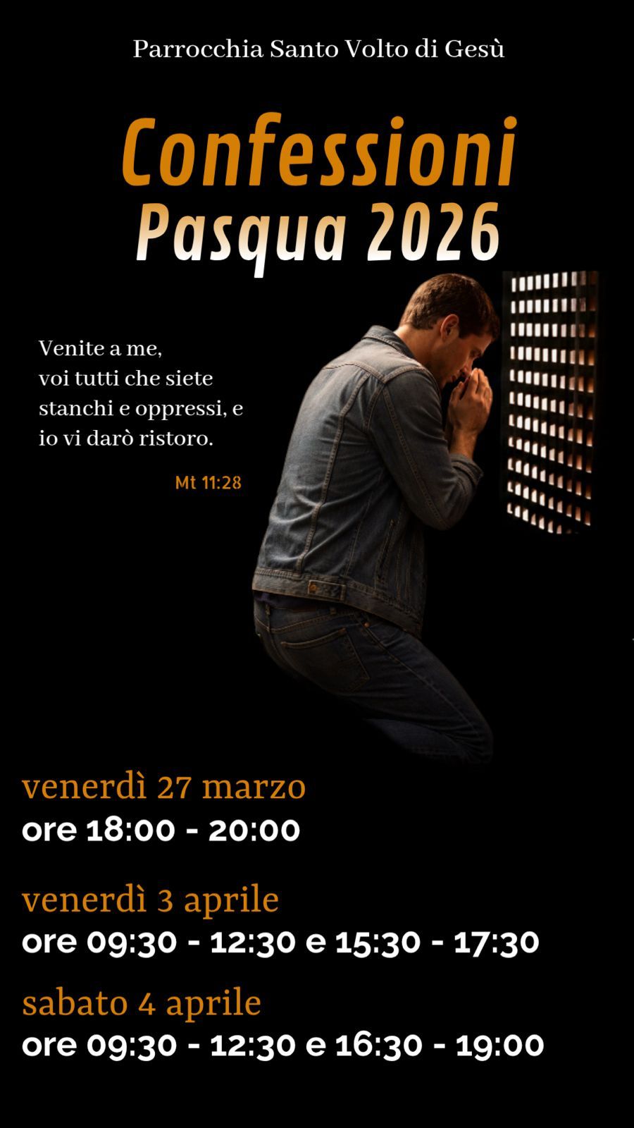 Vi ricordiamo che, per favorire la partecipazione al silenzio e alla preghiera del Triduo Santo, non saranno disponibili confessori dal pomeriggio di Giovedì Santo fino alla Veglia Pasquale. Invitiamo tutti a riconciliarsi nei giorni ed orari previsti da programma. Venerdì 3 aprile, giorno di digiuno e astinenza.